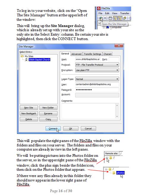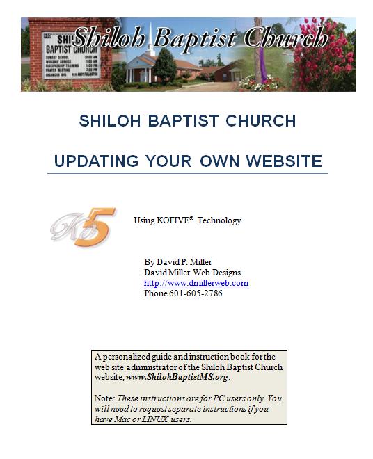 Here are some examples of what our printed User Guides look like. The first example is the cover page for the Shiloh Baptist Church website's Kofive User Guide; the second example is from page 16 of the guide.